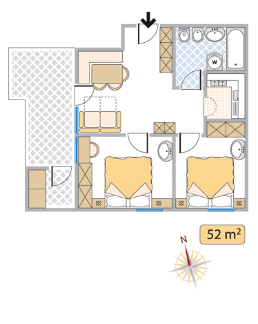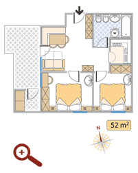 L'appartamento 22 con i suoi 52 m² è ideale per 4 persone. Dispone di due camere da letto, di un soggiorno e di un bagno (con lavatrice). La cucina è ben attrezzata e offre una lavastoviglie. Sul balcone si trova un ripostiglio.